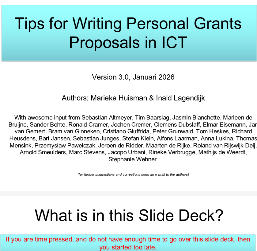 To support ICT researchers, Marieke Huisman and Inald Lagendijk, with the input from a large number of people in the field, created a slide set with tips for writing personal grant proposals in ICT.
